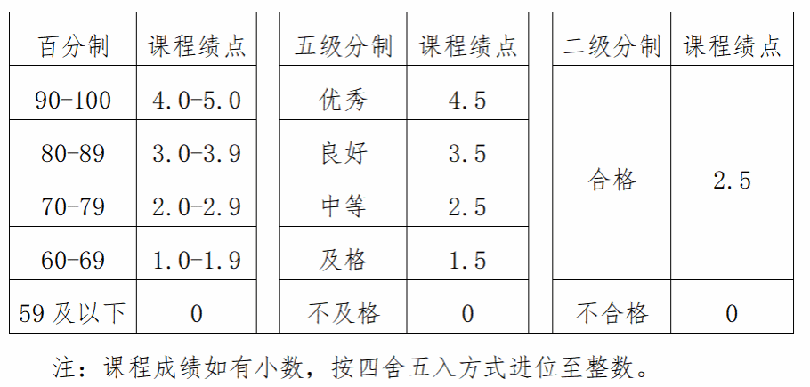 课程绩点与课程考核成绩的对应关系为: